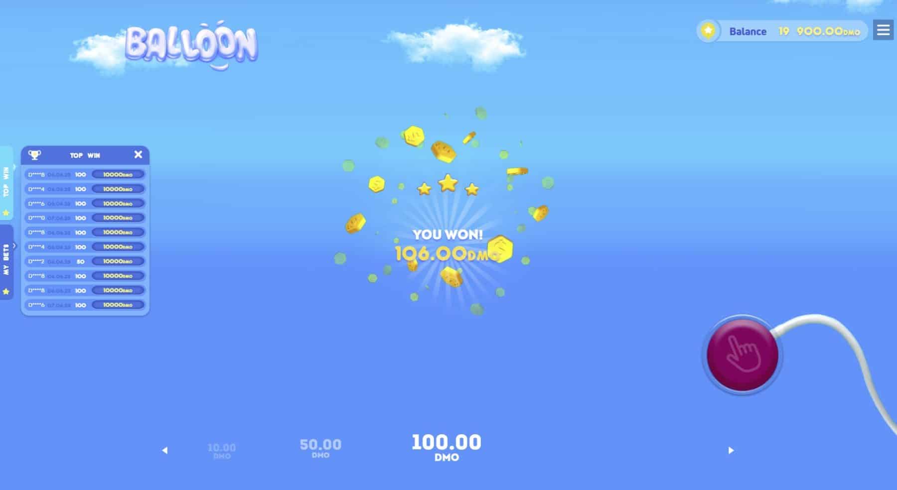 - Zbierz wygraną: Puść przycisk, zanim balon pęknie, aby zgarnąć wygraną (stawka × mnożnik). Jeśli balon pęknie, zanim puścisz przycisk, tracisz postawioną kwotę.